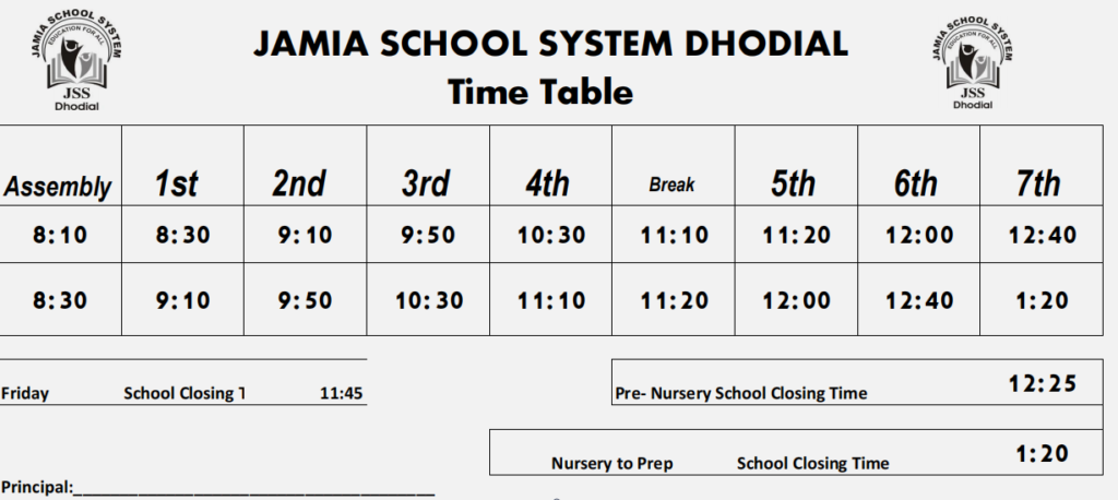 Jamia School Time Table Month of March to April